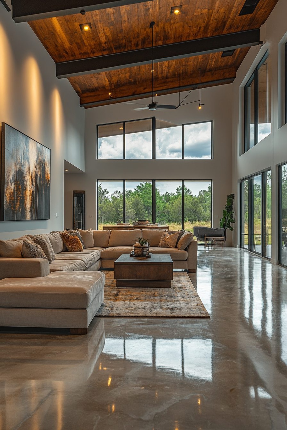 Rustic modernism is an exciting fusion of natural materials and contemporary design that invites warmth into any space. Wooden beams enhance the architectural beauty while exposed concrete floors provide a sleek contrast, making functionality stylish.