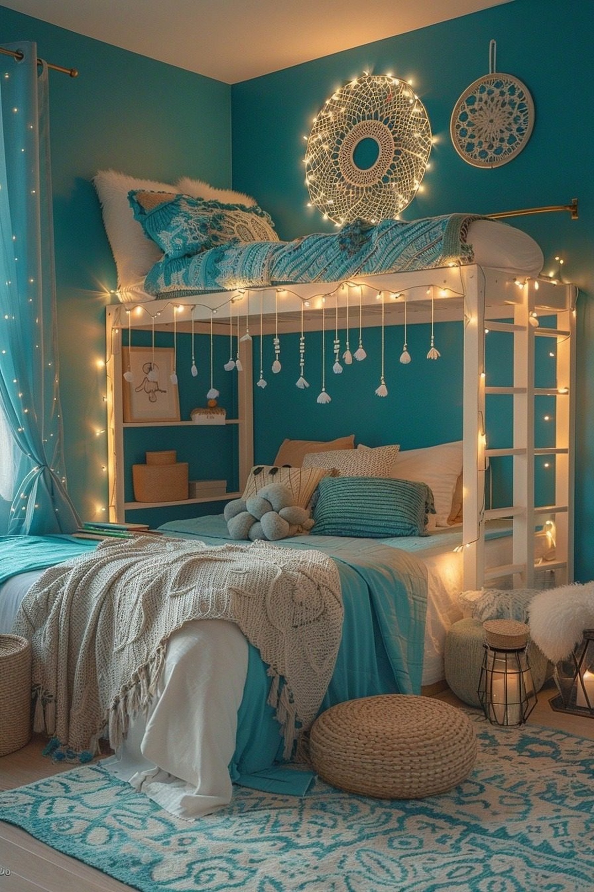 Twinkling fairy lights add a magical glow that dances softly against the walls, enhancing every corner's charm.