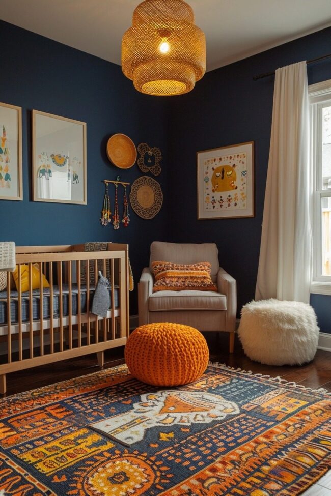 Rich blue walls create a stunning backdrop, allowing bright orange accents to dance throughout the space.