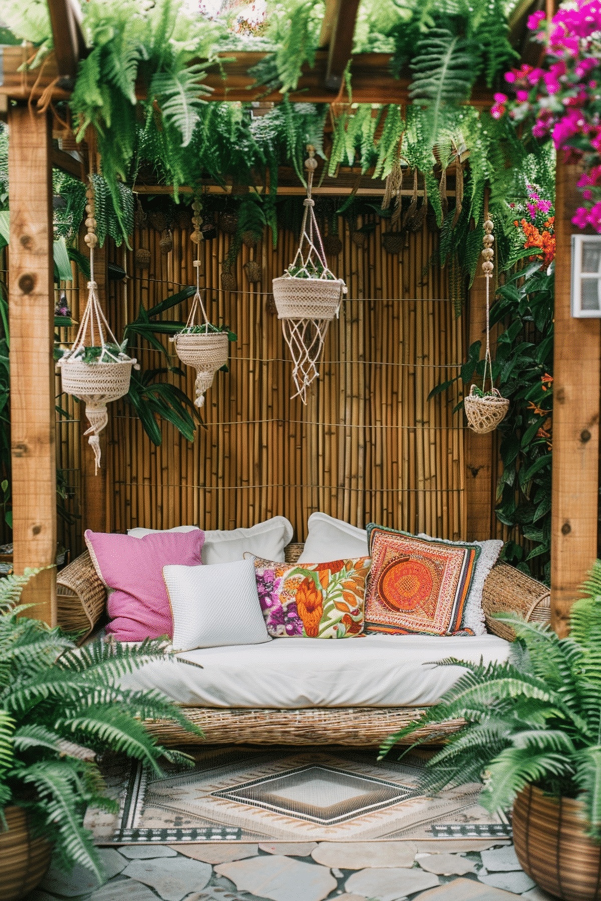 Creating a peaceful bohemian retreat outdoors invites relaxation and comfort.