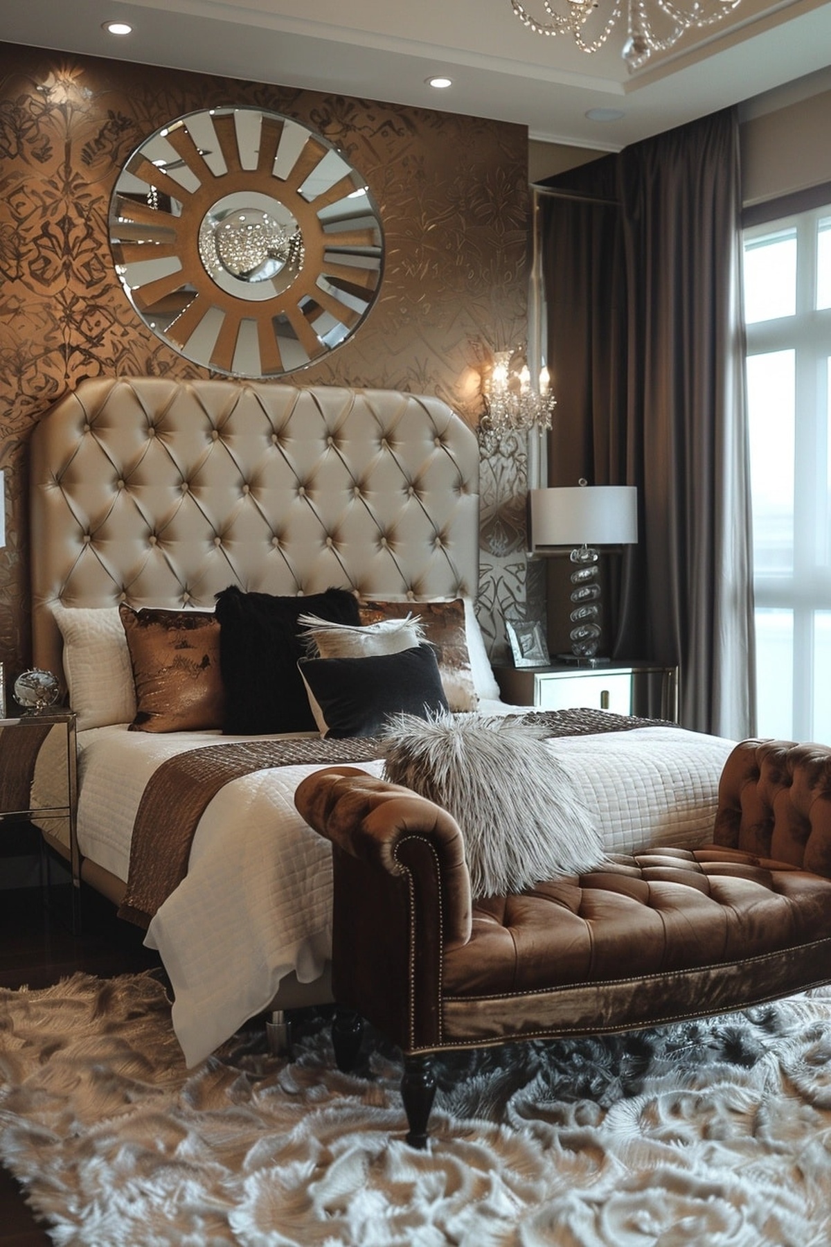 An Art Deco glam bedroom offers a blend of vintage elegance and modern sophistication.