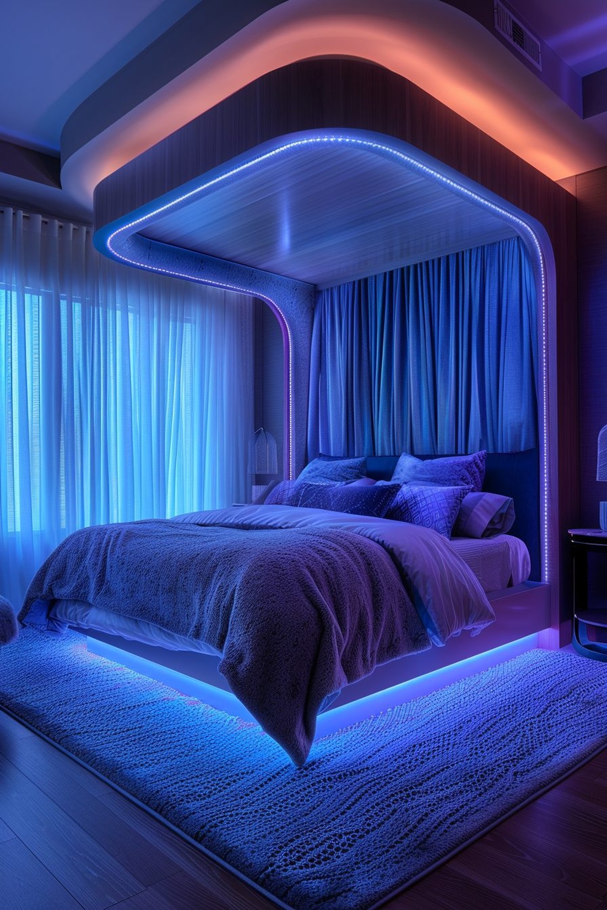 A futuristic sleep space fuses modern design with innovative materials and technology.