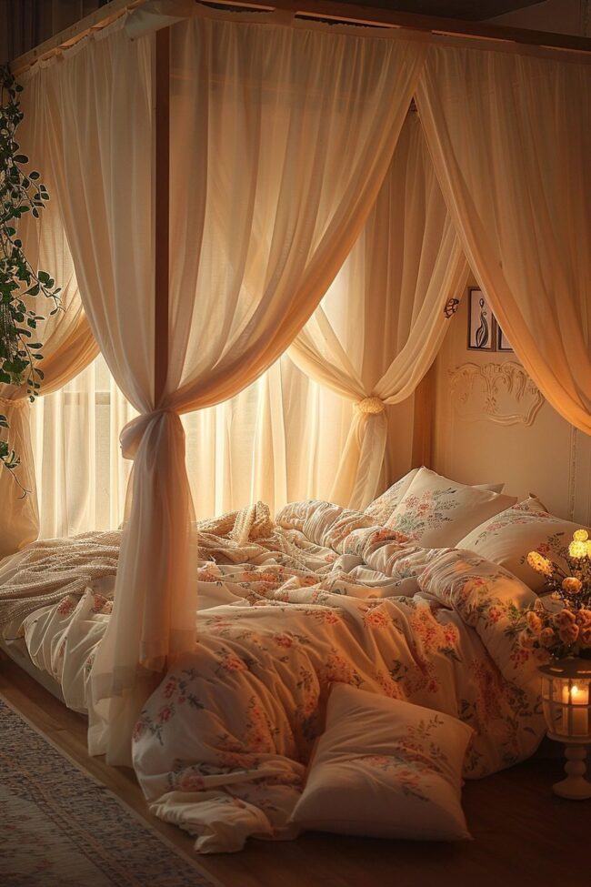 A romantic canopy bed sanctuary creates an intimate, serene atmosphere in the bedroom.