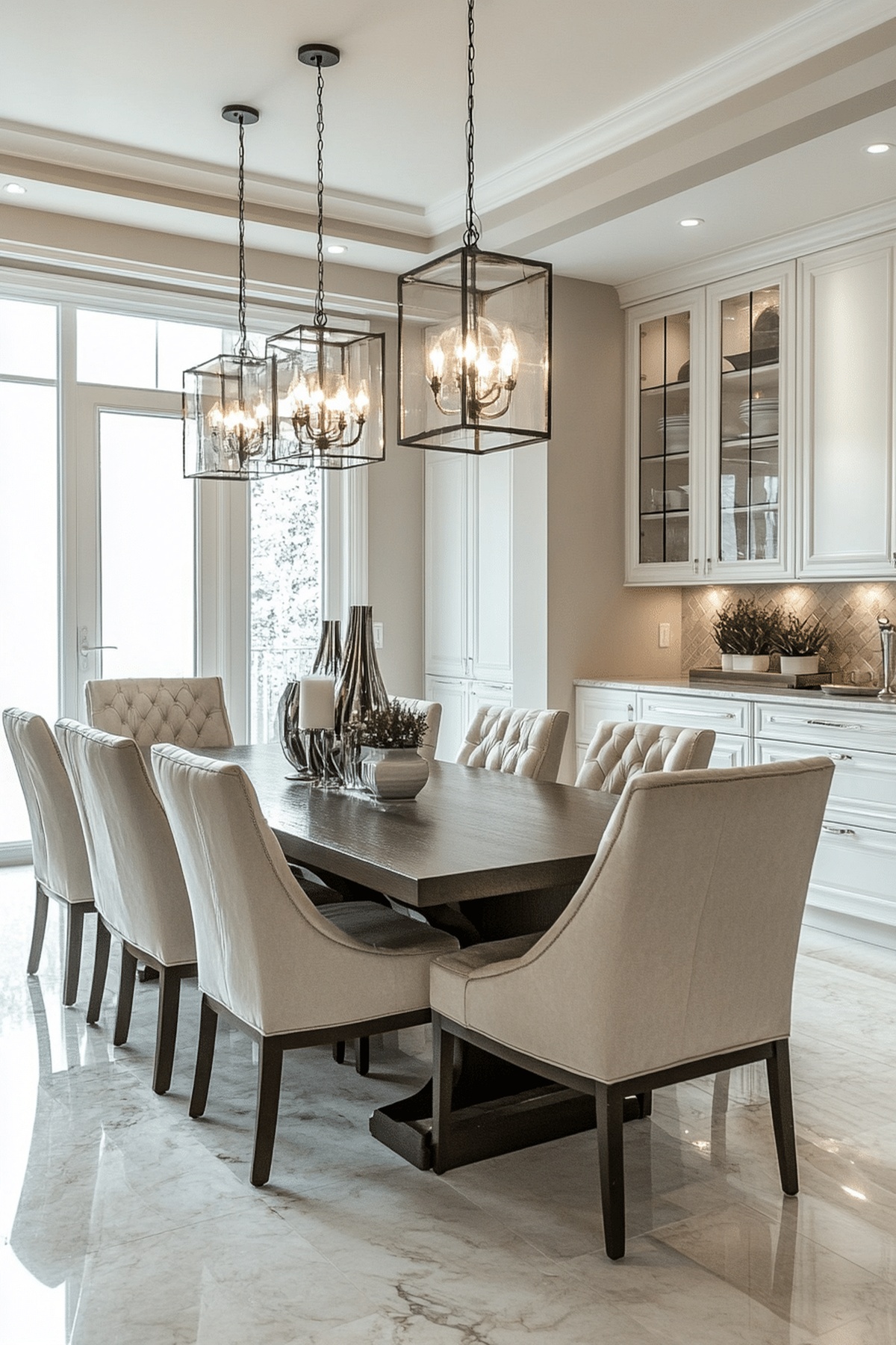 A sophisticated dining room brings together classic design and modern style, creating a space that feels timeless yet current.