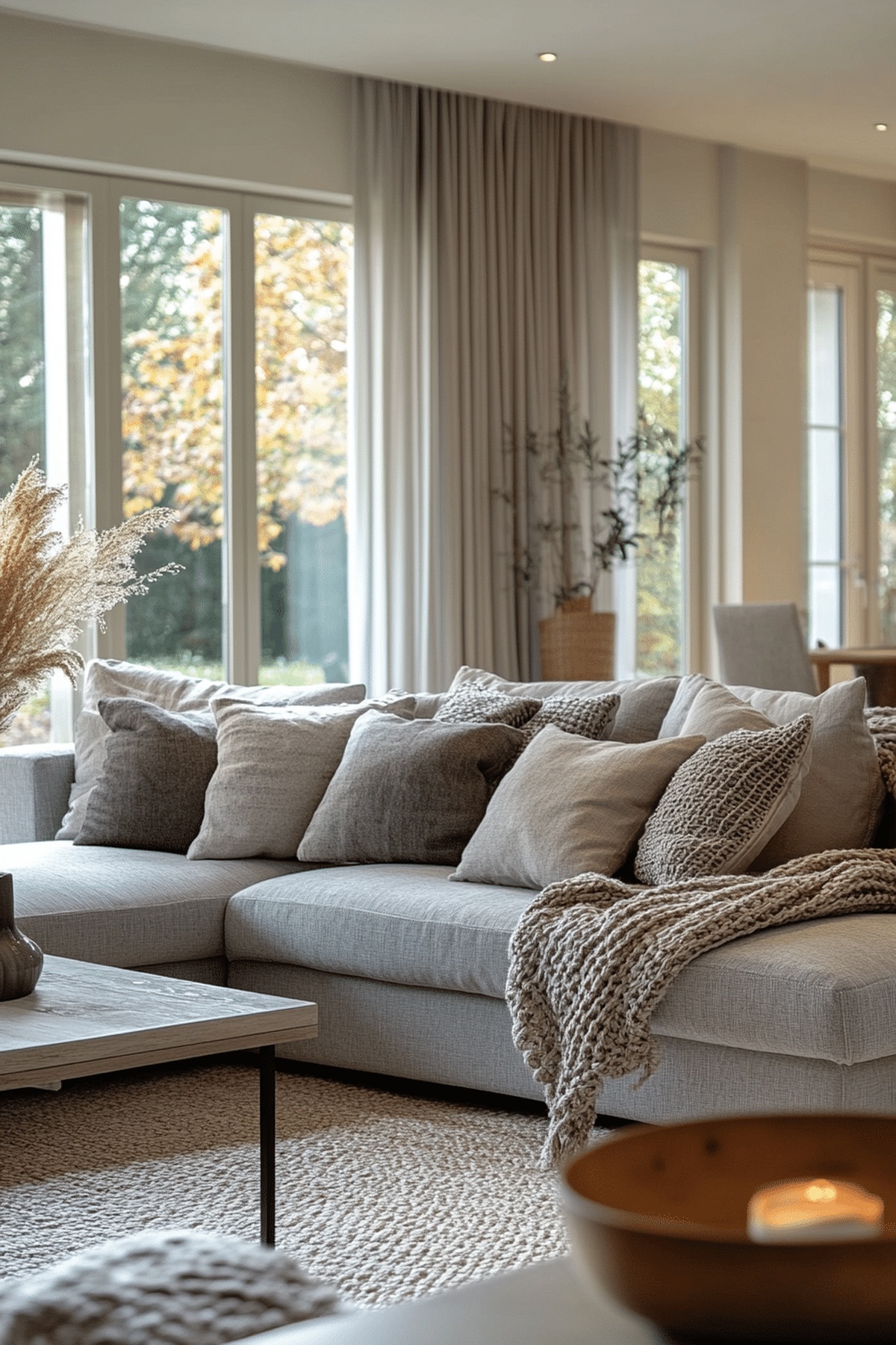 Grey sofa and soft textures complement each other perfectly in a cozy living room setup.