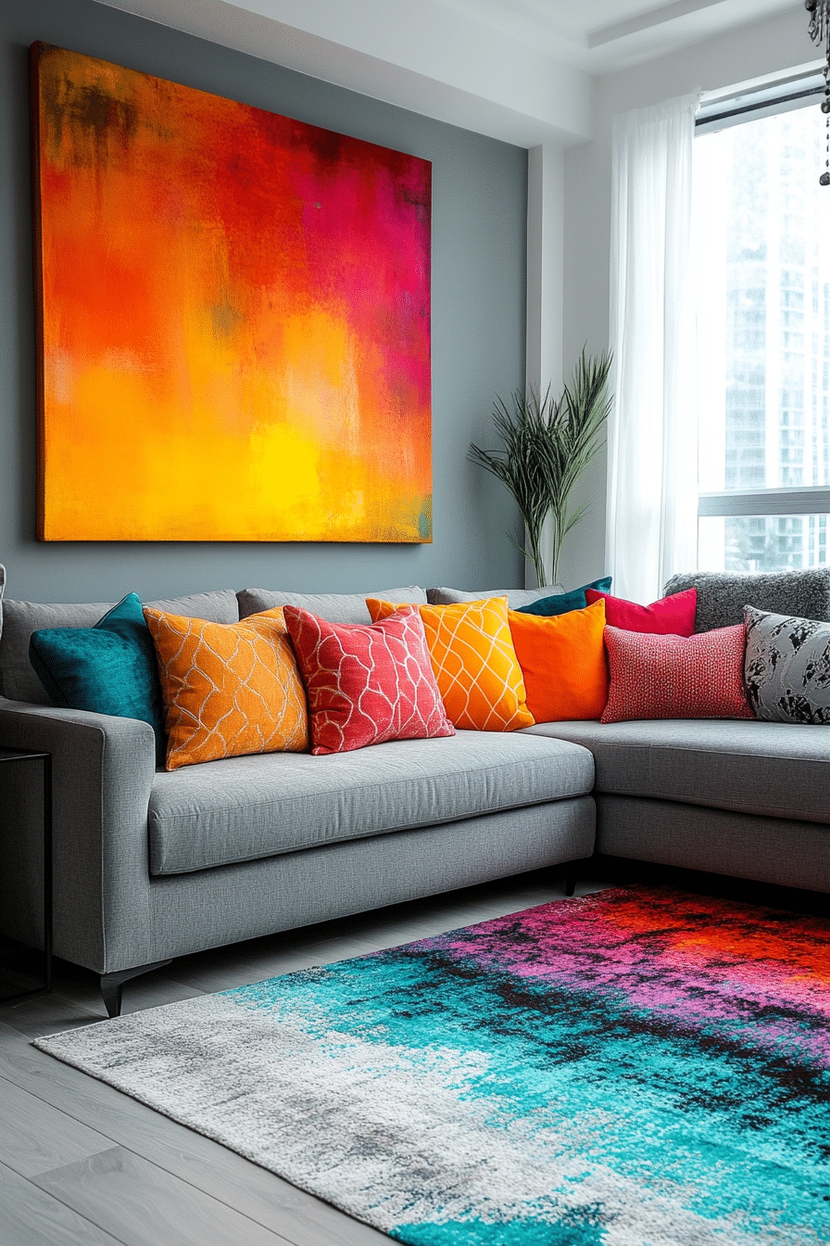 These colors provide a vibrant, yet sophisticated contrast to the neutral base of the grey sofa, making the room feel fresh and dynamic.