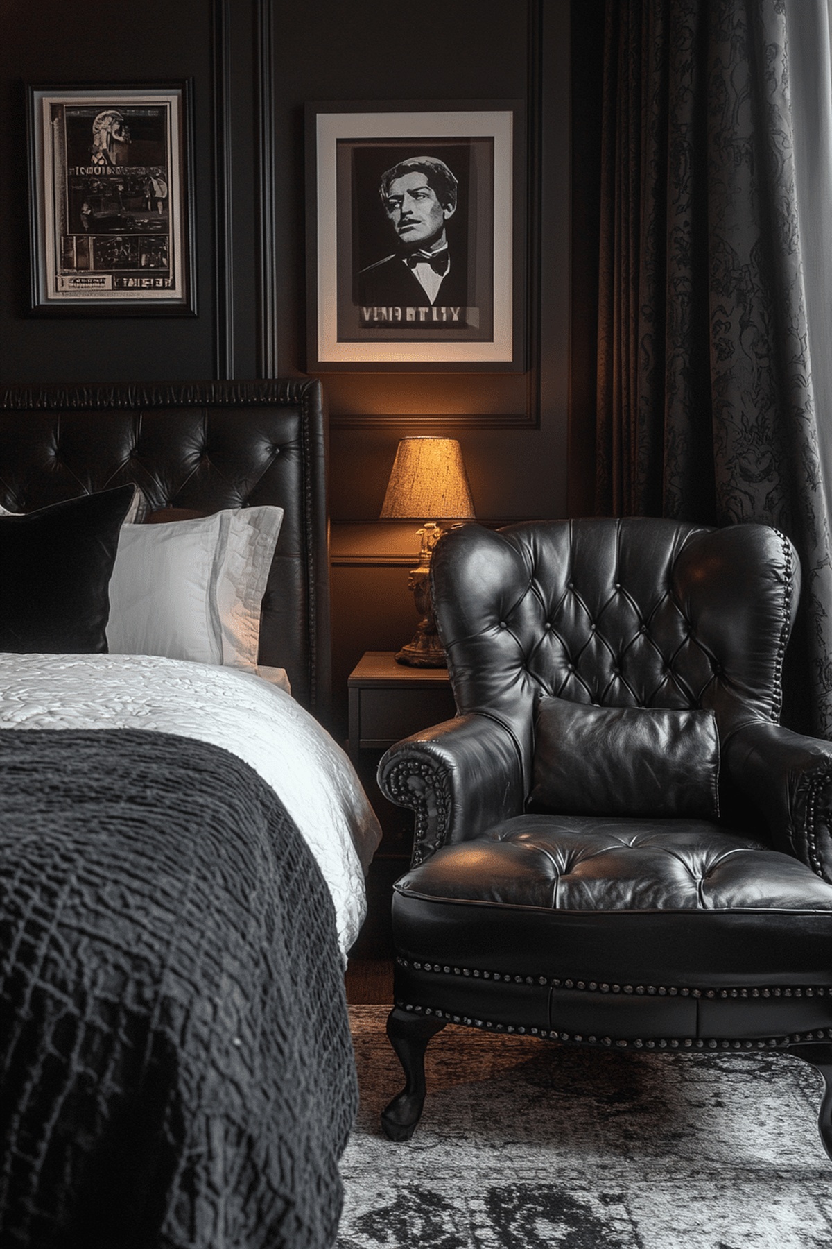 For those who are fascinated by the allure of noir cinema, this bedroom feels like stepping into a vintage film.