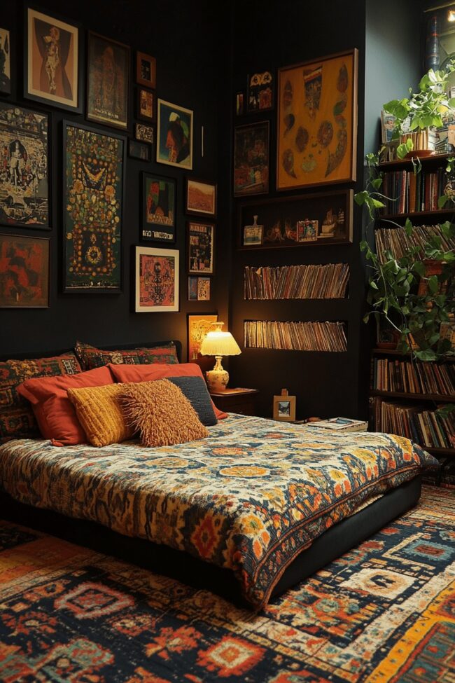 The room’s mix of dark and earthy colors enhances the bohemian vibe.