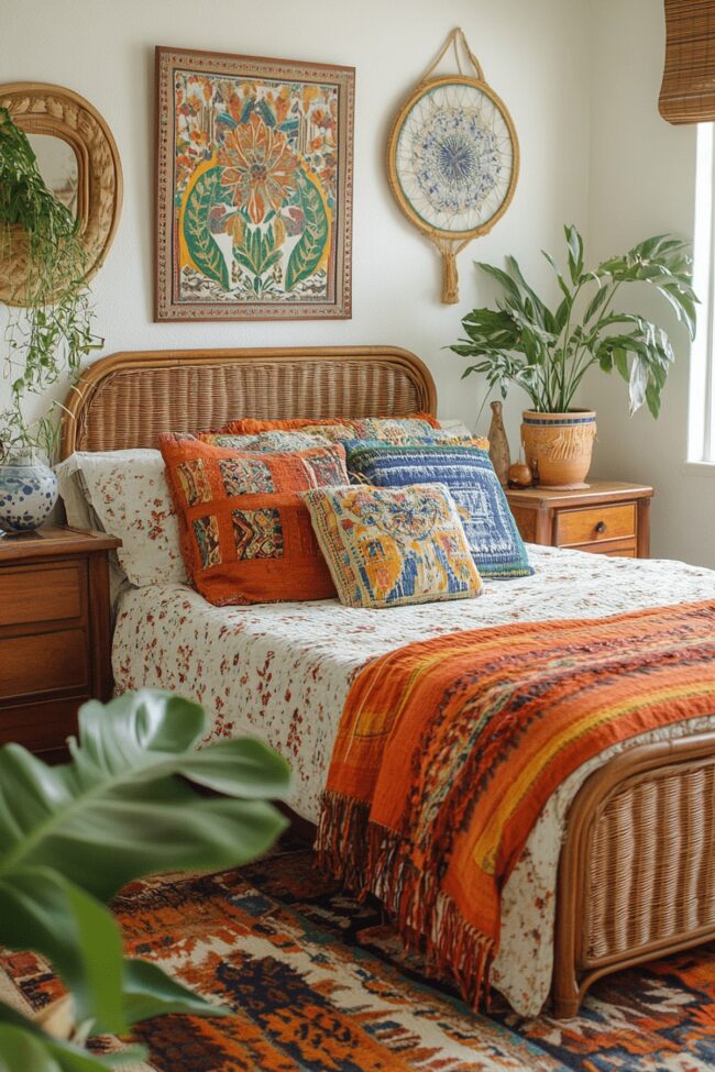 The beatnik 60s boho bedroom channels the spirit of the counterculture movement with its eclectic mix of patterns, colors, and textures.