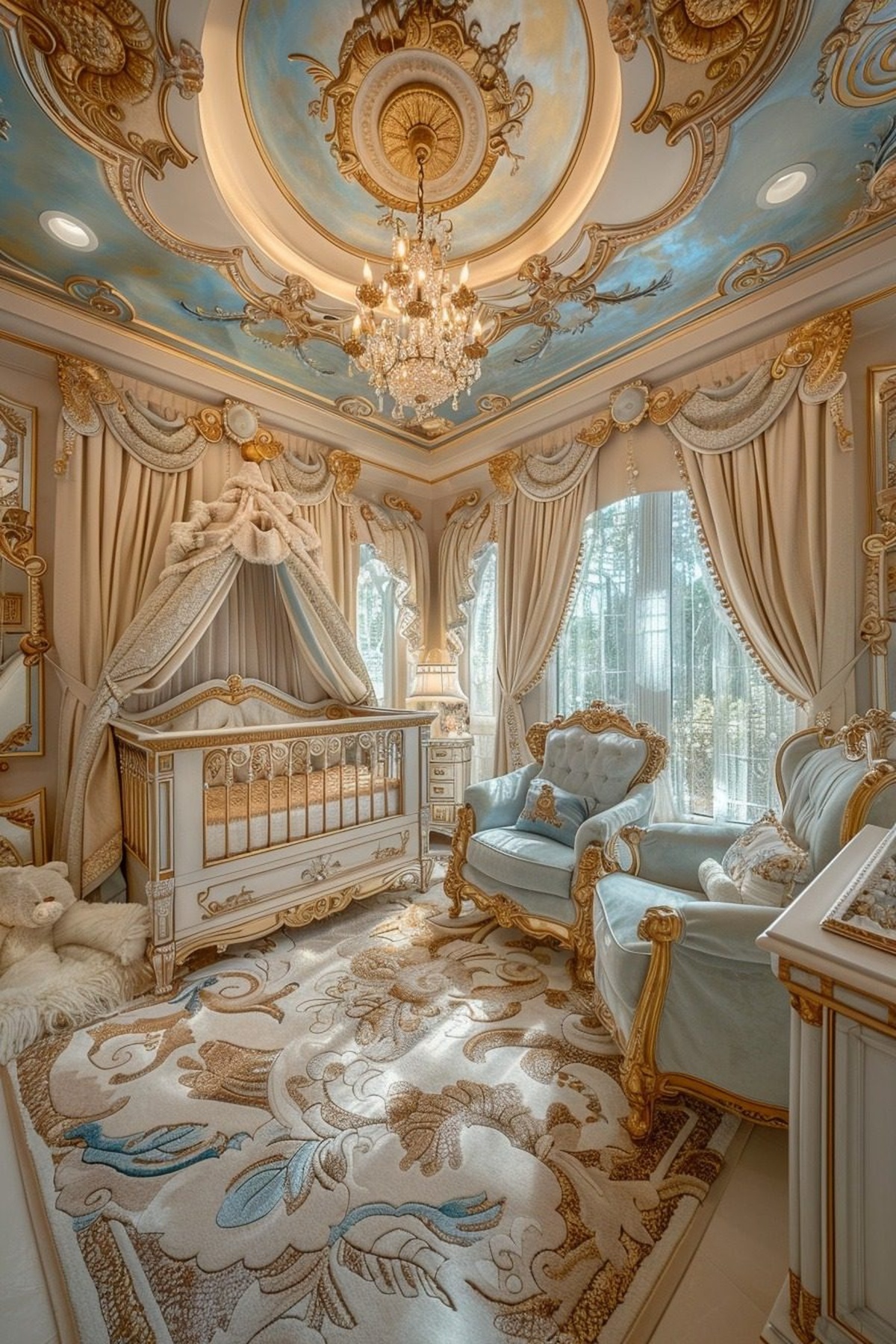 Luxurious nursery is a haven of elegance and comfort. Ornate ceilings adorned with intricate designs draw the eye upward, while soft lighting from an exquisite chandelier creates a warm ambiance.