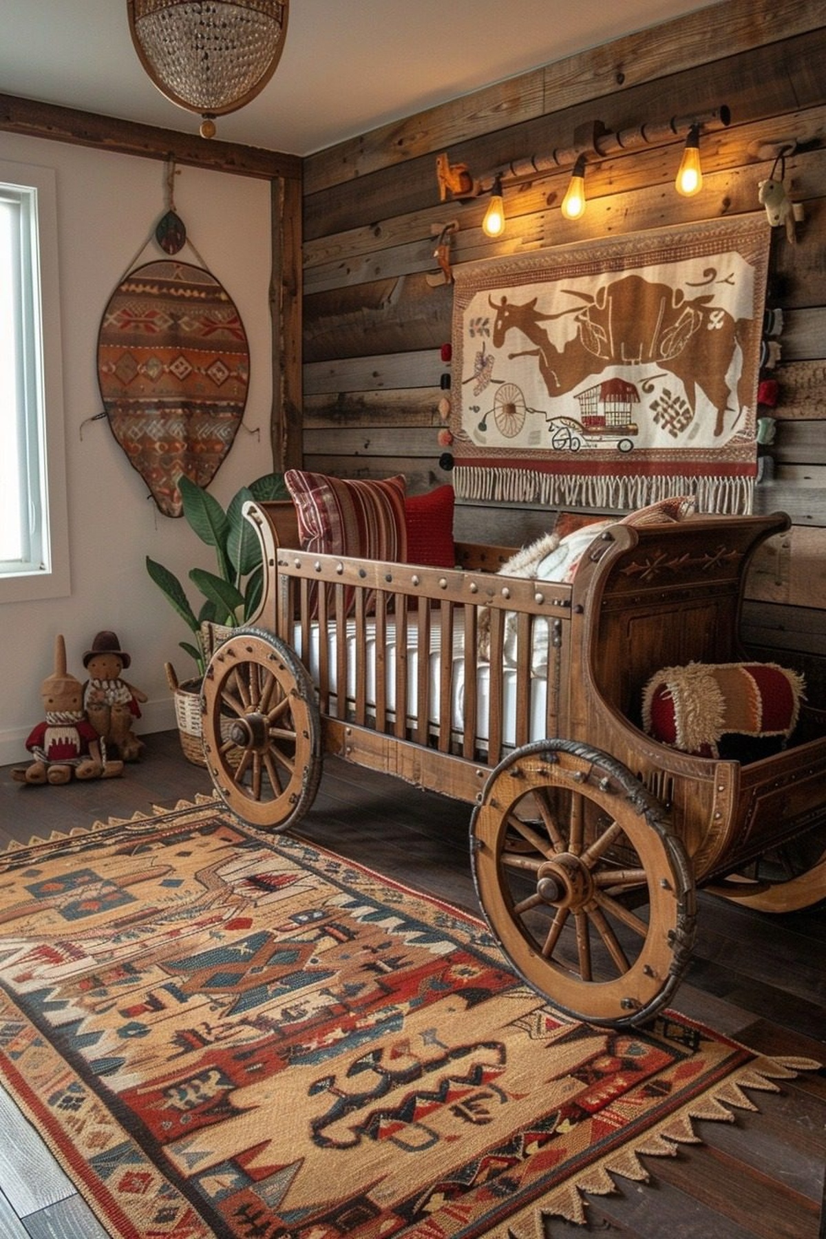 Rustic nursery is defined by warm wood tones, vintage decor, and playful accents. The rich paneling creates a cozy backdrop for cherished family photos and memorabilia that tell stories of the past.