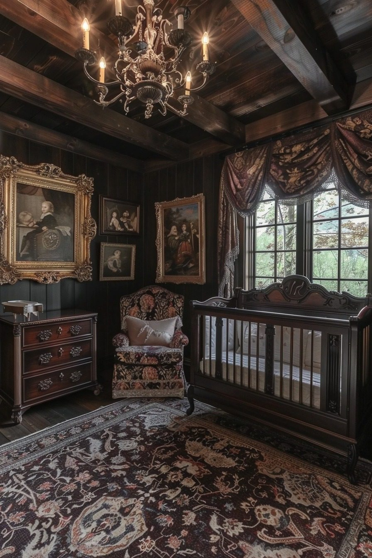 Vintage nursery is a delightful retreat filled with warmth and history. Rich floral wallpaper sets the stage, bringing nature indoors while antique wooden furniture adds timeless character.