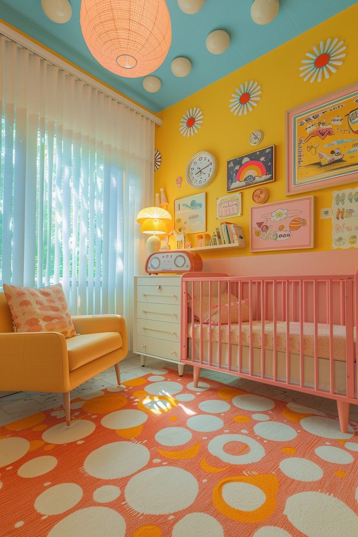 A playful mix of round patterns in the rug and artwork adds vibrant energy to the space while offering visual stimulation. Incorporating cheerful lighting fixtures enhances warmth, casting a gentle glow that soothes during bedtime routines.